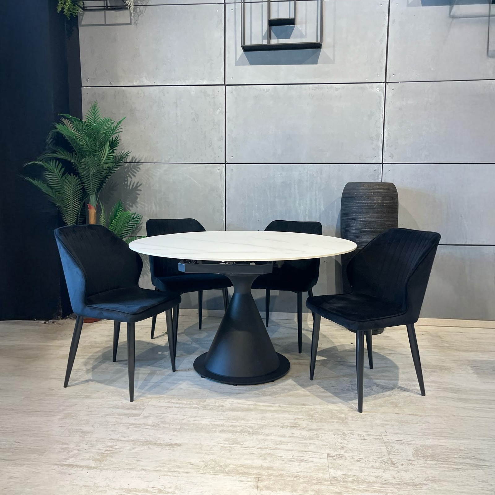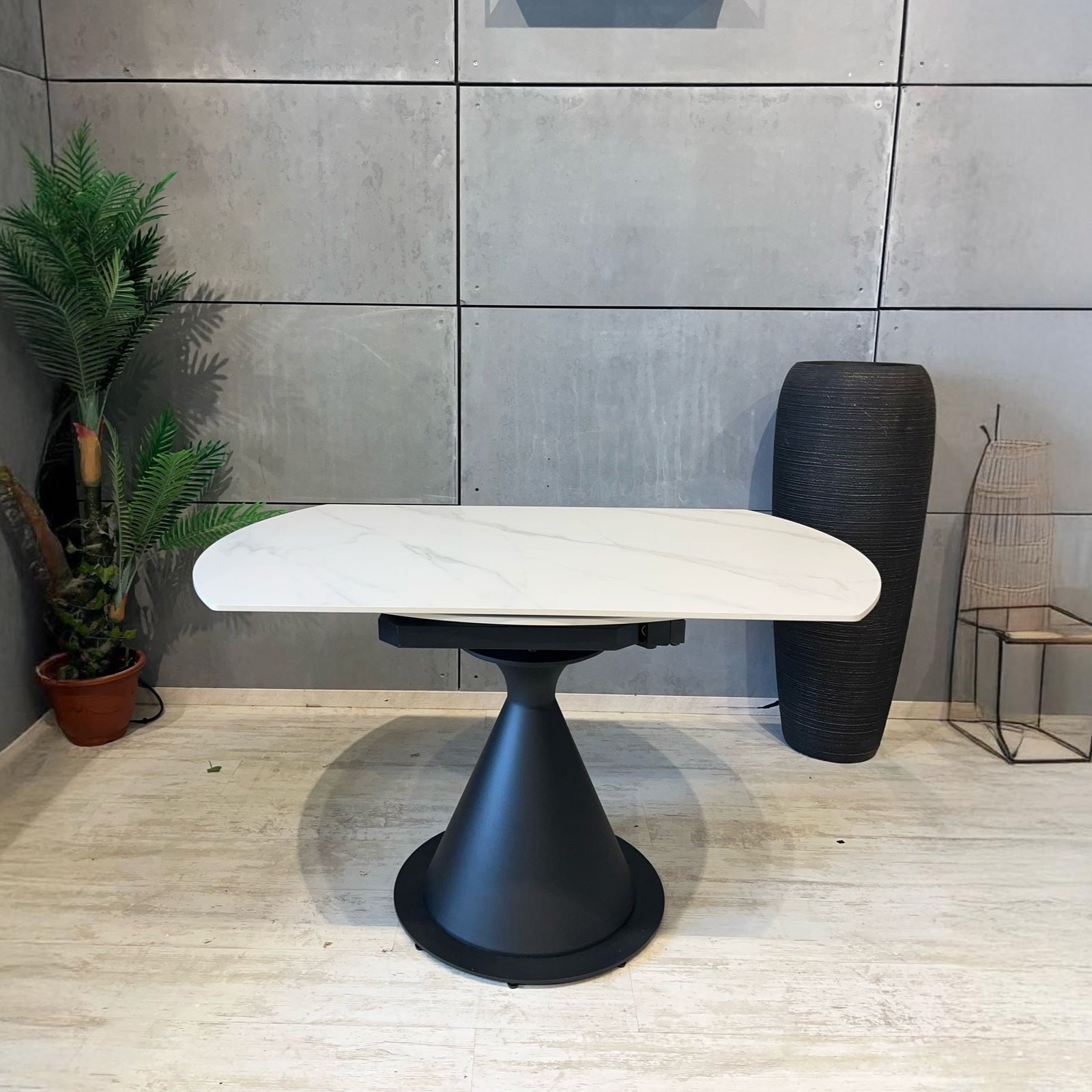 שולחן אוכל קרמי מעוצב בקוטר 130 ס"מ, הנפתח למידות 130/80 ס"מ, עם רגל ברזל מגולוון במראה מודרני שמשלב בין עמידות לאלגנטיות.